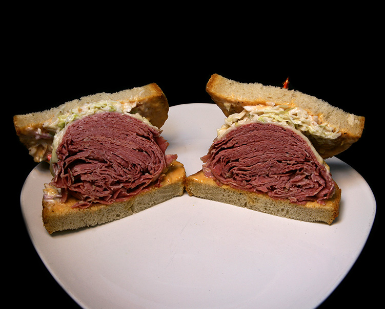 Stacked corned beef, coleslaw, Russian dressing, swiss cheese on grilled rye